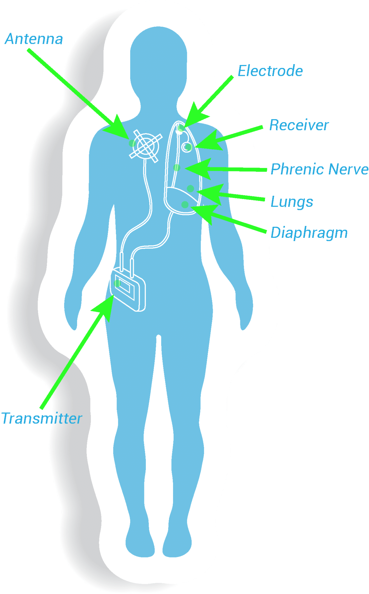 El sistema de estimulación diafragmática Avery consta de receptores y electrodos implantados quirúrgicamente , y un transmisor externo con antenas que se coloca directamente sobre los receptores implantados. El transmisor y las antenas externas envían energía de radiofrecuencia a los receptores implantados justo debajo de la piel. Los receptores convierten las ondas de radio en impulsos estimulantes. Estos impulsos se transmiten a través de los electrodos hasta los nervios frénicos, provocando la contracción del diafragma. Esta contracción produce la inhalación de aire. Cuando los impulsos cesan, el diafragma se relaja y se produce la exhalación. La repetición de esta serie de impulsos genera un patrón respiratorio normal.